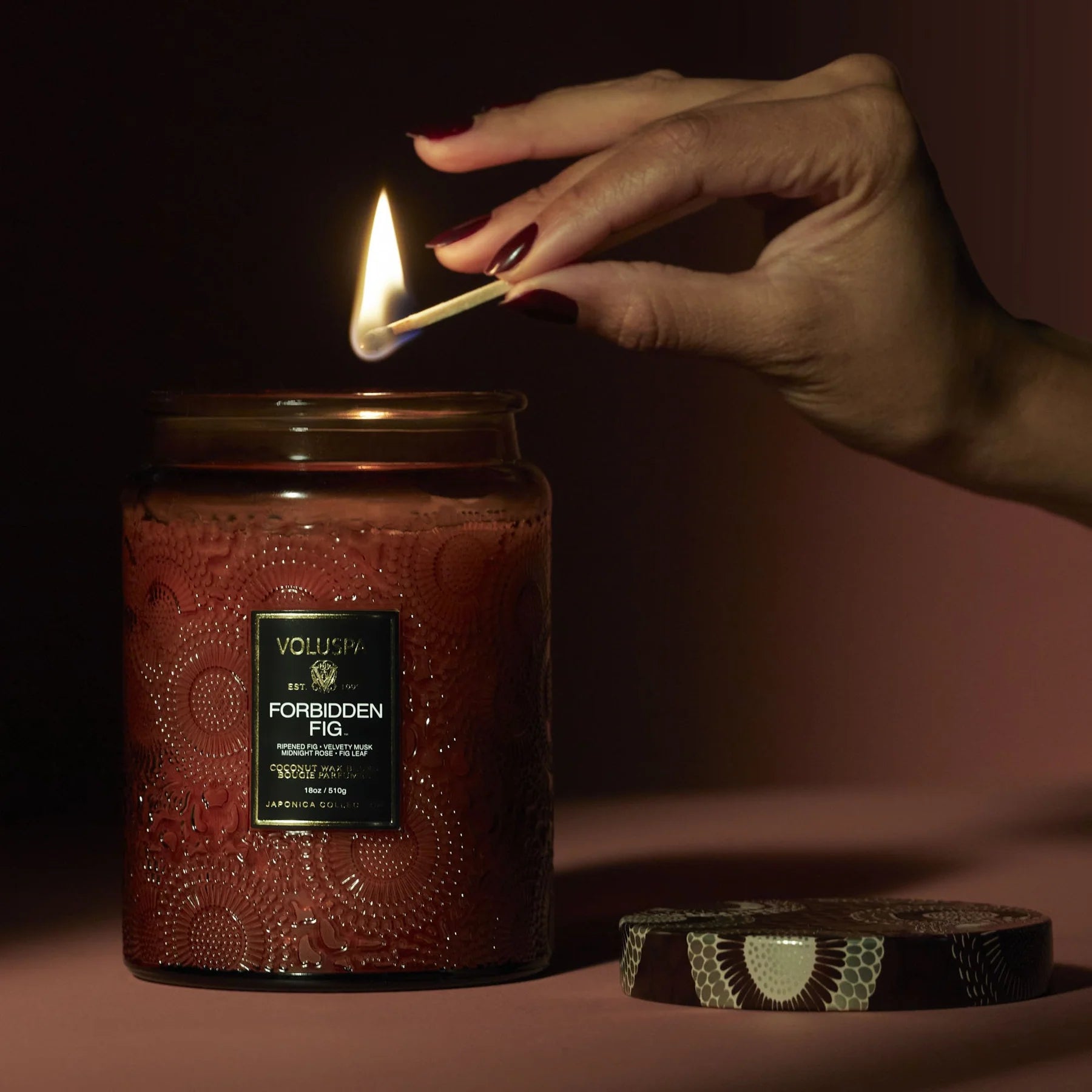 VOLUSPA's Forbidden Fig unearths the pure magnificence of the wild fig tree. Rooted down in the dry sun-drenched soil, smooth white bark unfolds with fragrant facets of lush green leaves. This matriarch of the orchard is crowned with succulent dark fruits, filled with coveted sweet nectar and armed with sophisticated woody stalks.
